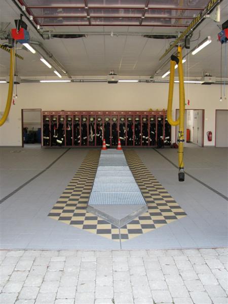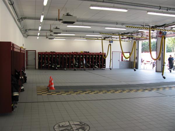 Jeder Fahrzeugstellplatz ist mit einem Stromanschluss zur Ladeerhaltung der Batterie sowie einem Druckluftanschluss zum Laden des Bremsfederspeichers versehen, um im Einsatzfall ohne Wartezeit ausrücken zu können.